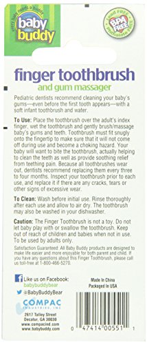 Nurture a lifetime of good oral habits with proactive oral care. Safely brush new baby's teeth and massage tender gums with Baby Buddy's Silicone Finger Toothbrush. Stage 2 of a complete, 6-Stage Oral Care System, these innovative care products grow with your child from birth to age 12. The first 4 stages are designed to take care of budding baby teeth from the start with state of the art, safe and soft products that children love to chew on. Stages 5 and 6 progress to distinctive toothbrushes for ages 4 months to 12 years that easily clean those hard-to-reach places where food and plaque can build up and cause cavities and other oral problems. Stage 2 Silicone Finger Toothbrush fits snugly over your finger to softly clean, massage and soothe baby's gums and teeth. The Finger Toothbrush is the second step in taking care of precious teeth by providing optimal cleaning power and minimizing possible damage to gums and teeth. The Silicone Finger Toothbrush, made of 100% FDA approved food grade silicone, is BPA free and dishwasher safe. Baby Buddy's Silicone Finger Toothbrush offers an easy, portable solution for babies aged 3 months and older. Properly cleaning teeth and gums helps remove sugars and bacteria that can lead to future decay. Give your child the gift of a lifetime of good oral care habits with the innovative Stage 2 Silicone Finger Toothbrush by Baby Buddy. Check out our other Baby Buddy products because Every Baby Needs a Buddy.Stage 2 of Baby Buddy's 6-Stage Oral Care Program that grows with your child from birth to age 5 helping develop a love of brushing and good oral habits