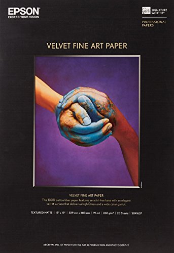 Epson Velvet Fine Art Paper (13" x 19") (20 Sheets/Pkg). Artists and photographers require a variety of media surfaces for their professional work. Epson is proud to introduce its first cotton paper for the desktop market Velvet Fine Art Paper. With a base that is 100% cotton rag buffered and acid free this paper is coated with our popular Enhanced Matte coating giving exceptional color gamut and high D-Max. The velvet surface is a favorite of photographers and artists alike offering a unique museum quality feel. Combining impressive fine art cotton with Epson technology has created a paper that will be a classic for years to come. Epson Velvet Fine Art Paper (13" x 19") (20 Sheets/Pkg). Small Format 13" x 19".13 x 19 velvet fine art paper.