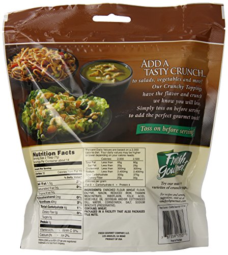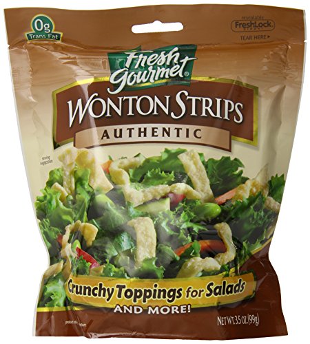 Flavorful and crunchy, authentic wonton strips add great texture and taste to Asian Dishes. Looking for the perfect addition to your Asian salads, entrĂ©es and side dishes? Look no further. In response to the overwhelming popularity of homemade Asian cuisine, the kitchens of Fresh Gourmet have developed flavorful, crunchy Wonton Strips. Add these ready-to-serve Wonton Strips to your salads, soups, main dishes or sides and taste the Fresh Gourmet difference! At Fresh Gourmet, we bring good taste to your table – every day. Fresh Gourmet is the number one brand of croutons and salad toppings sold in the world. Long known for the innovative approach that inspired the original produce crouton, the Fresh Gourmet brand offers the largest variety of salad toppings available on the market today. As salad toppings experts, Fresh Gourmet sets the pace with today`s trends, offering busy cooks the crunch, flavor and texture that transform everyday dishes into memorable meals in minutes. For nearly 30 years, Fresh Gourmet continues to be the one brand you turn to for the Crunch You Crave!Our Fresh Gourmet won ton strips authentic flavor comes in 3.5 ounce (pack of 9). Also available in 1 lb bag. Our won ton bring Lightly salted with a crispy, bubbly texture