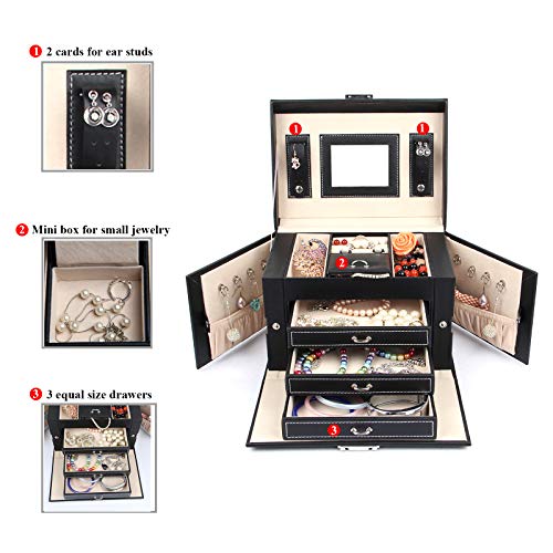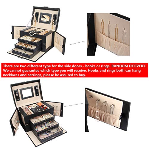 RATIONAL COMPARTMENTS: 4 layers with 3 pull-out drawers, 2 side doors with 8 necklace hooks/rings,2 ear stud cards, 1 ring roll, 1 mini box, 7 different size pouches. TIP: There are two different type for the side doors - hooks or rings. RANDOM DELIVERY. We cannot guarantee which type you will receive. Hooks and rings both can hang necklaces and earrings, please be assured to buy.