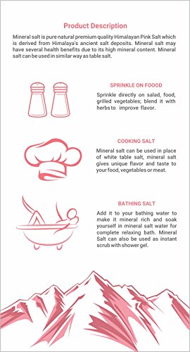 Mineral nutrient are essentially required by all living organism. Major minerals available in human body are calcium, phosphorus, potassium, sulfur, sodium, chlorine, magnesium, iron, cobalt, copper, zinc, molybdenum, iodine, selenium etc. Himalayan Pink Salt contains 84 different types of minerals. Mineral Salt is pure natural premium quality Himalayan Pink Salt which is derived from Himalaya's ancient salt deposits. Mineral Salt may have several health benefits due to its high mineral content. Mineral Salt can be used in similar way as table salt.100% NATURAL HIMALAYAN PINK SALT-- Mineral Salt contains 100% natural Himalayan Pink Salt from Himalayas in PAKISTAN and packed in INDIA. Mineral Salt contains 84 minerals a few of which include sodium chloride, sulphate, calcium, potassium, magnesium, copper, iron as compare to 2 minerals (sodium and chloride) in normal salt. When you consume pink salt, you actually get less sodium intake per serving than regular table salt.