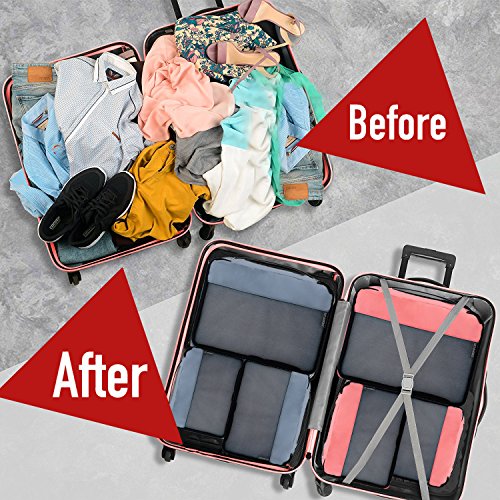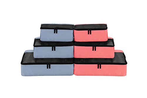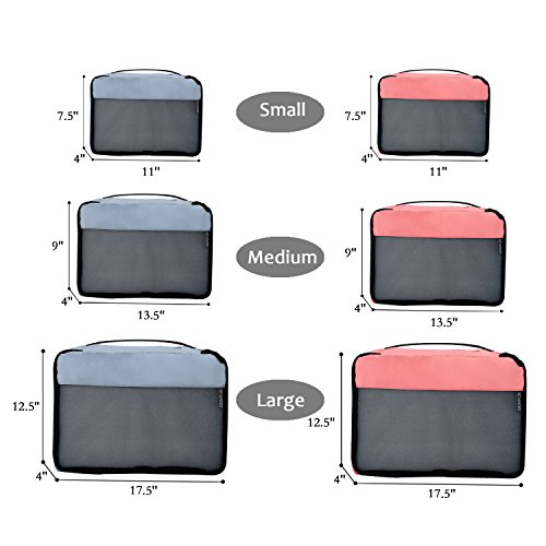 Thoughtful Design-These travel packing organizer bags come in 6 set, 2 color at 3 size:Small is 11×7.5×4 inches (L×W×H),Medium is13.5×9×4 inches (L×W×H) ,Large is 17.5×12.5×4 inches (L×W×H)).Different color easy to tell, different size separate clean and dirty cloth, washing tools, cosmetics or other small gadgets.