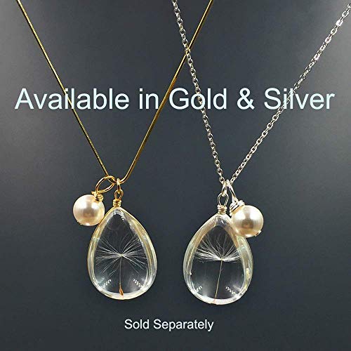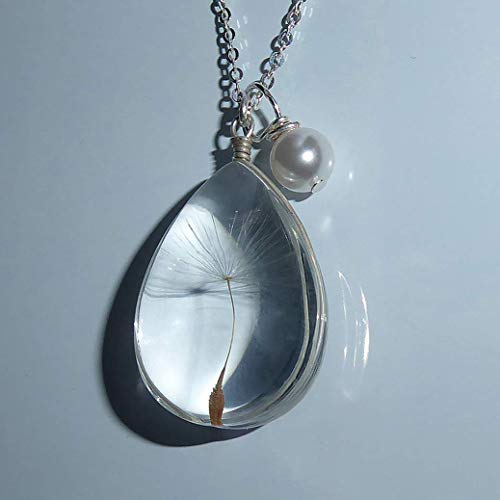 Our most popular Dandelion wish necklace is a very sweet and charming necklace that fits any style range and any age range. The Dandelion clear glass pendant is about the size of a quarter. The Swarovski crystal pearl charm gives this piece a unique elegance. The pearl is removable. The 18" chain is sterling silver, and comes with a silver -plated chain extension. This necklace would make a unique and lovely gift for a loved one or even for yourself. This necklace is perfect for the holidays. Comes in an Aimée Trésor Jewelry gift box. Satisfaction Guaranteed. Do not wear in pool or hot tub as prolonged exposure to water and certain chemicals will may tarnish silver.Dandelion Wish Glass Pendant Necklace on Sterling Silver Clain Birthday, Valentine's Day, Women's and Girl's
