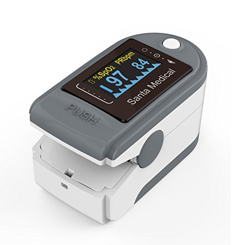 The newly upgraded SantaMedical SM-165 Finger Pulse Oximeter is an affordable and accurate way to check pulse rates and blood oxygen saturation levels. Self-adjusting finger clamp plus simple one-button design allows for easy operation. Small portable size makes it easy to handle and carry. Helpful for athletes and pilots to obtain quick and accurate oxygen saturation readings.