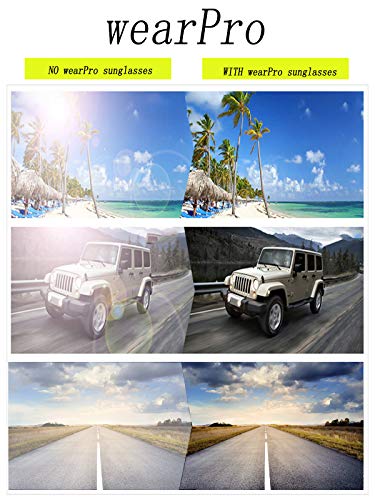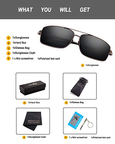 wearPro sunglasses is a professional manufacturer with years of experience in sunglasses production and manufacturing.We are committed to protecting human eyes and restoring true colorswearPro invites you to enjoy true colors togetherSizeLensWidth:2.45inchesLensHeight:1.65inchesFrameLength:5.78inchesBridgeWidth:0.6inchesTempleLength:5.30Package1x Sunglasses1x Soft Glasses Cloth1x Screwdriver1x Exquisite Packaging Carton1x polarizing test cardboard1x brand cardboardWhat you cannot imagine Helps you restore true colors without being disturbed by harmful light--High-definition polarized lens design can block ultraviolet rays and strong light, well protect your eyesLightweight magnesium-aluminium material, demonstrating your gentlemanliness and temperament--Mg-Al metal frame design, ultra-light experience does not produce pressureThe best companion to travel outdoors --Whether you are hiking, fishing, hiking, shopping or driving, he is your best companion.Intimate detail design- Rubber nose pads give you comfort. - Unique rubber pattern on temples increases friction and prevents sunglasses from falling off.30 DAY MONEY BACK GUARANTEE-100% satisfaction guaranteen--If for any reason you are unsatisfied, just contact us and you will receive a courteous and prompt refund.Let's enjoy color togetherNotes:To avoid damage, never clean your sunglasses with paper towels or clothing, and also avoid using household detergents or soaps, just use clean water and included cloth.Don't toss your sunglasses in your purse without a protective case. The interior of a bag, often filled with key and other loose objects, is the one cause of damage.Do not maintain the sunglasses in such bad environment of high temperature or long time damp, to avoid deformation.【HD Polarized Lens】100% UV400 protection lens blocks 100% Harmful UVA, UVB & UVC Rays.wearPro Polarized sunglasses for men HD polarized lenses can protect your eyes from harm and help you restore true colors to enjoy pets from nature.