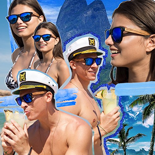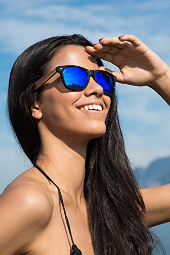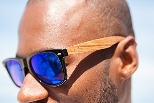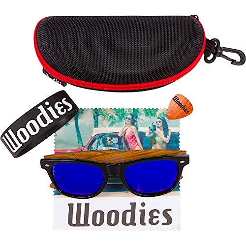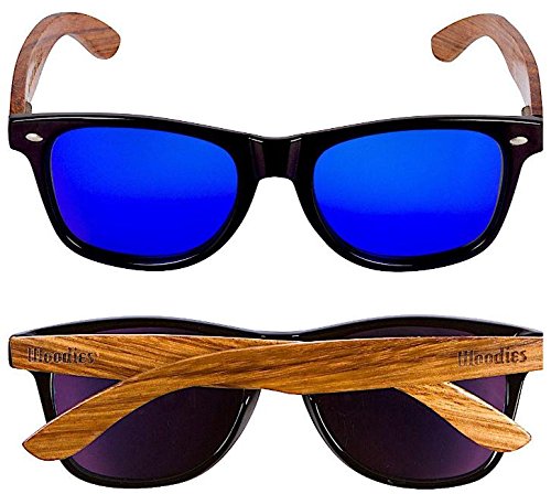 Woodies Zebra Wood Sunglasses with mirror lens offer a combination of 100% real zebra wood arms that support a wayfarer style plastic frame. The lightweight zebra wood offers a comfortable fit that is durable and sturdy at the same time. Our unique stainless-steel, double-spring hinges are sturdy and designed to keep their shape year after year. The lenses are specially designed so that they are both dark and polarized, offering 100% UVA/UVB protection even in intense lighting conditions. These glasses are stylish, durable, and natural. Each pair includes a durable black carrying case, a microfiber lens cleaning cloth and a wood guitar pick! 30-Day Money back Guarantee With Woodies, I set out to create the world's best value for $25 sunglasses. Compare these to Shwood, Knockaround Toms, Neff, 4est, Quay, Oakley, and even RayBans! If you're not convinced these are the best quality for $25, we'll give you a full refund. Espanol: Lentes de Sol para Hombre y Mujeres, GafasHandmade from REAL Zebra Wood (50% Lighter than Ray-Bans)