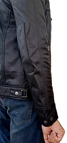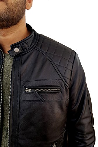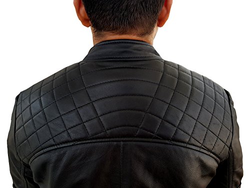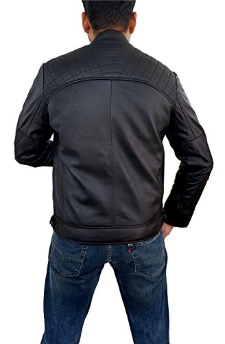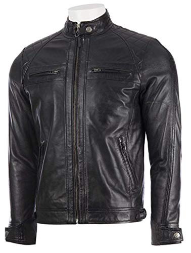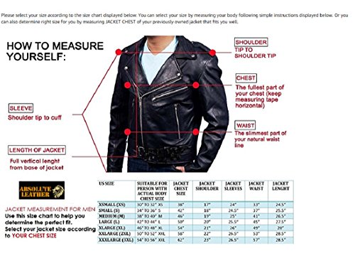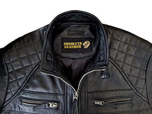 SAVIO is a super stylish and premium black leather biker jacket with classic diamond topstitch detail. It features a sturdy YKK zip front up to a stand collar with buckle and loop strap to hold it in place. Additionally there are leather panels at the elbow. On the body you find 4 zip pockets plus buckled adjusters on the waist. The cuffs are adjustable with 2 press studs while the interior is fully lined and incorporates a further 2 pockets. Using a high grade genuine lambskin leather we are really excited about this design. The Jacket is made of 100% Lambskin Leather. We procure the best leather skins that are available in the market. All our products are hand crafted in our workshops. Each jacket is hand checked before being shipped out. We offer you "Absolute Satisfaction" as our name suggest. ABSOLUTE LEATHER owns the credit of always providing 100% genuine leather with perfect stitch, comfort, feel and fashion.Real Lambskin Leather -- 100% High Quality Full Grain Genuine Real Lambskin. Lambskin leather is soft, thin and most supple skin resulting in buttery texture. It stretches well and tends to reshape after wearing. Drapes well, flows, and has good movement. Leather we use is all handpicked and durable which makes sure that this classic leather masterpiece is long lasting and could endure extreme weather conditions for years to come.