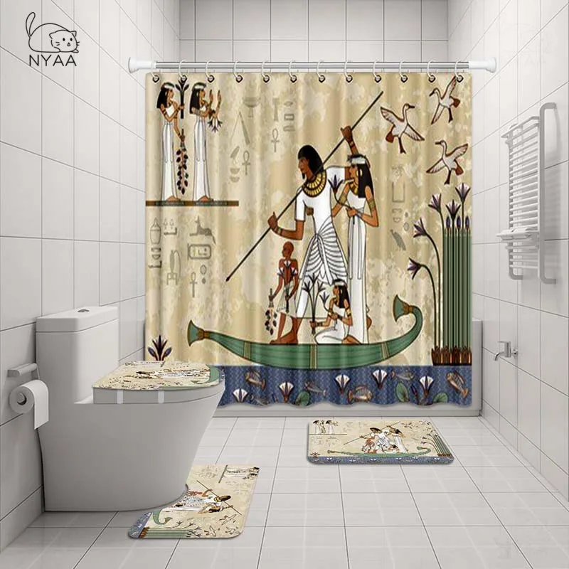 NYAA 4 Pcs Set Ancient Egypt Shower Curtain Pedestal Rug Lid Toilet Cover Mat Bath Mat Set For Bathroom Decor