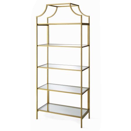 All that glitters is gold. Be a shooting star and break the mold by adding a touch of luxurious style to your living space with this sophisticated etagere bookcase from the Nola collection. This narrow etagere bookcase features five open shelves, each with a safety-tempered glass surface that adds an extra pop of style to your home decor. These glass shelves make the perfect spot to store books, folders, and other around home essentials. Switch it up and use it as a display area for pictures of your family, vases full of flowers, or any other of your lifes most prized possessions. Its rounded edges and curved indent design give it a stunningly unique appearance that is sure to grab the attention of your friends and family. Constructed from sturdy metal and finished in Satin Gold, this sleek and elegant bookcase adds classic beauty to any room and will have you living in the lap of luxury.Features five open shelves, perfect for storage and display